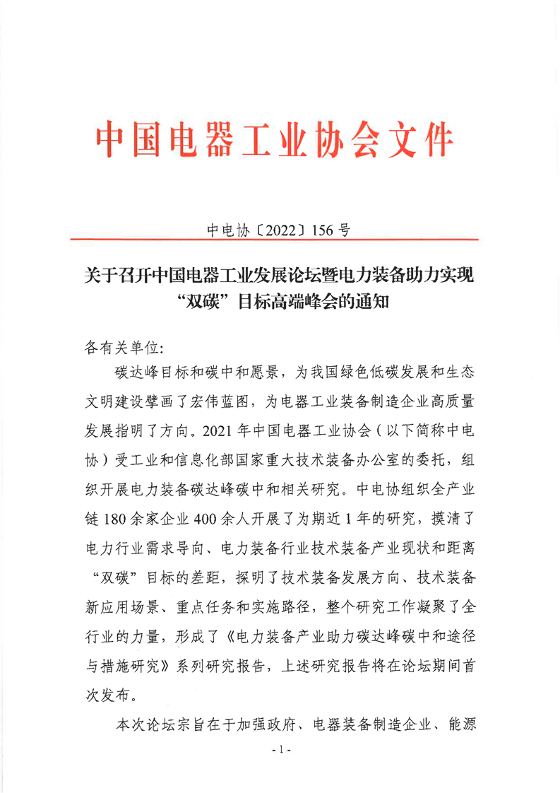 关于召开中国电器工业协会发展论坛暨电力装备助力实现双碳目标高端峰会的通知